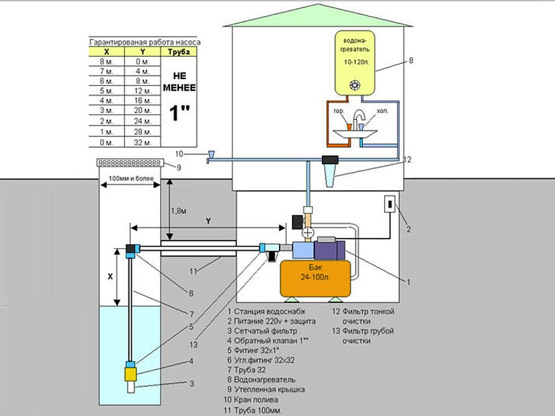 Представленная схема подходит только для неглубоких скважин. Ситуация заключается в том, что центробежные насосы хорошо действуют на напор и плохо на всасывание. Поэтому они способны поднимать воду с незначительной глубины. У стандартных модификаций уровень напора превышает глубину всасывания в 2-3 раза. К примеру, глубина всасывания — 9 метров, а высота напора — 30 метров. Это предусматривается при монтаже насосной станции. Она представляет из себя модульную сборку из различного оборудования, которое необходимо для водоснабжения.